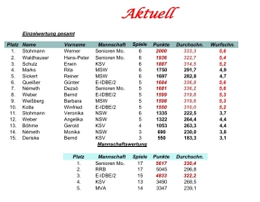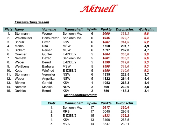 | Platz Name Vorname Mannsch. Spiele Punkte Durchschn. Wurfschn. 1. Weber Bernd E-IDBE/2 2 700 350,0 5,8 2. Nemeth Dezsö Senioren Mo.1 2 692 346,0 5,8 3. Zimare Hans Senioren Mo.1 2 687 343,5 5,7 4. Kismárton Ferenc Senioren Mo.1 2 687 343,5 5,7 |