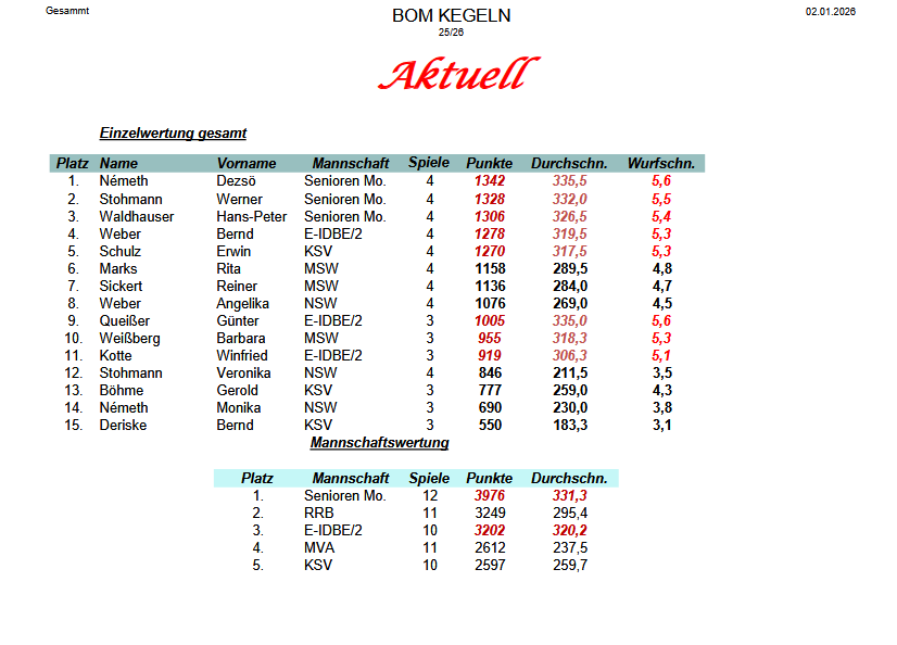 Dezsö Nemeth führt mit 2042 Durchschnitt 340,3 nach 6 Spieltagen die Tabelle an. Ilona Müller hat einen Spieltag weniger und einen Durchschnitt 340,2 . Kismárton Ferenc konnte sich auf den 2.Platz vorarbeiten Durchschnitt 336,2 . Mit 5,6 folgen dann noch 3 Keglerinnen/Kegler Exner Waltraud, Parthey Corina und Bernd Weber.